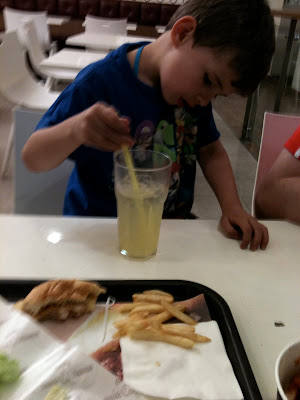 Benjamin was in school and Asher is tiny(and waving at this picture of the Gundam) so I took Sam with me up to seoul to get our van. We started out going to Dunkin' Doughnuts:
